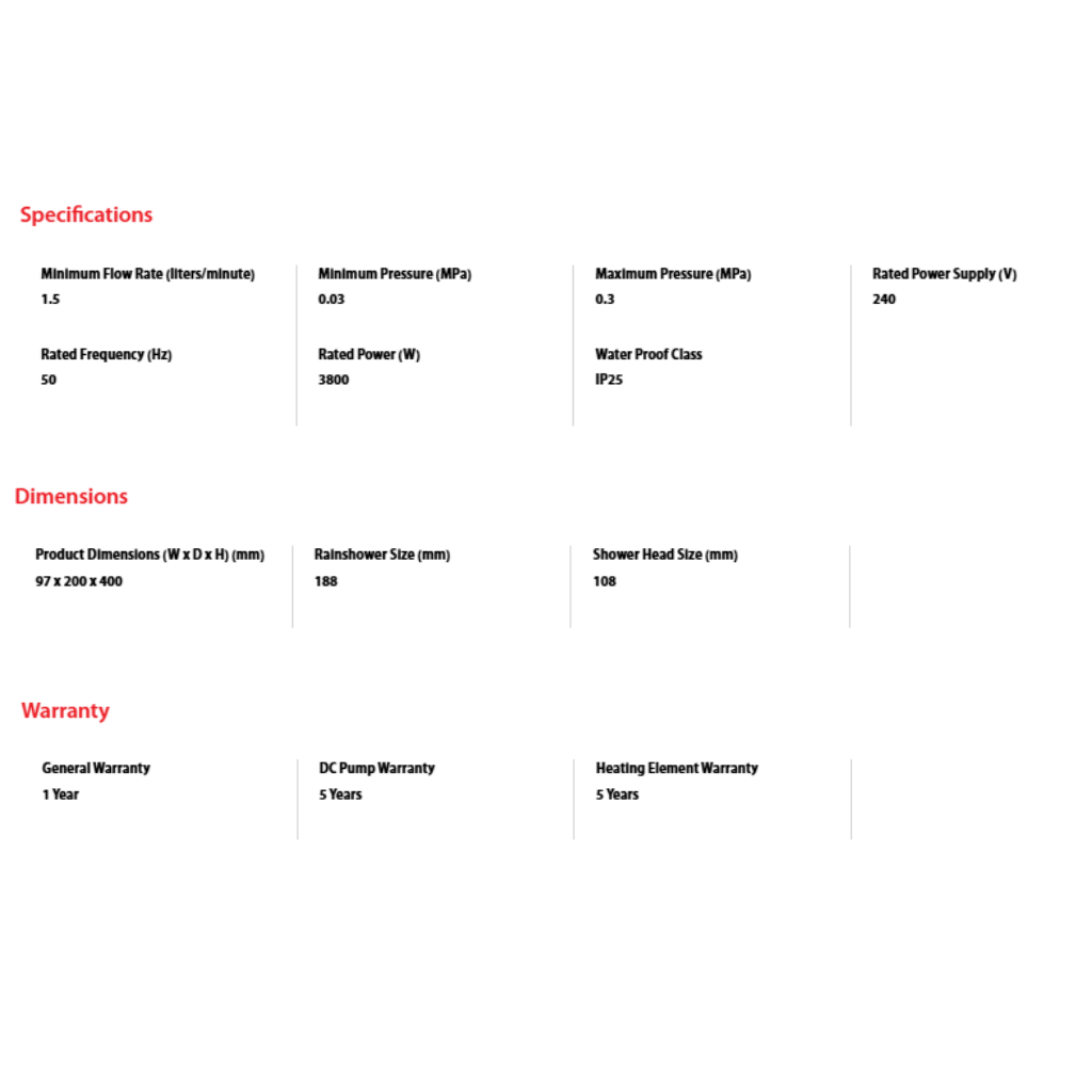 • Power: 3.8kW. • Features: DC Pump, Rain Shower, Digital Temperature Display. • Color: Black. • Warranty: 5 Years Pump, 5 Years Heating Element, 1 Year General Warranty.