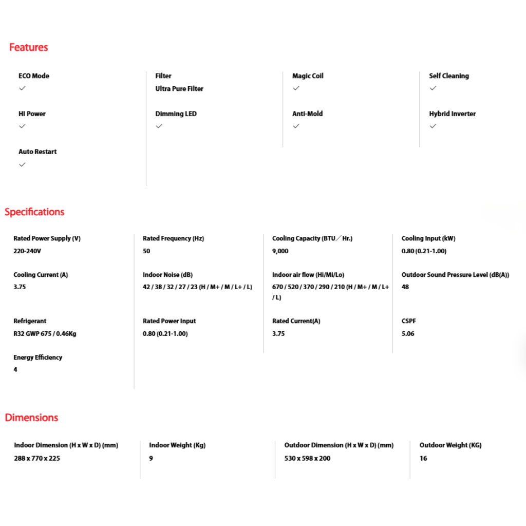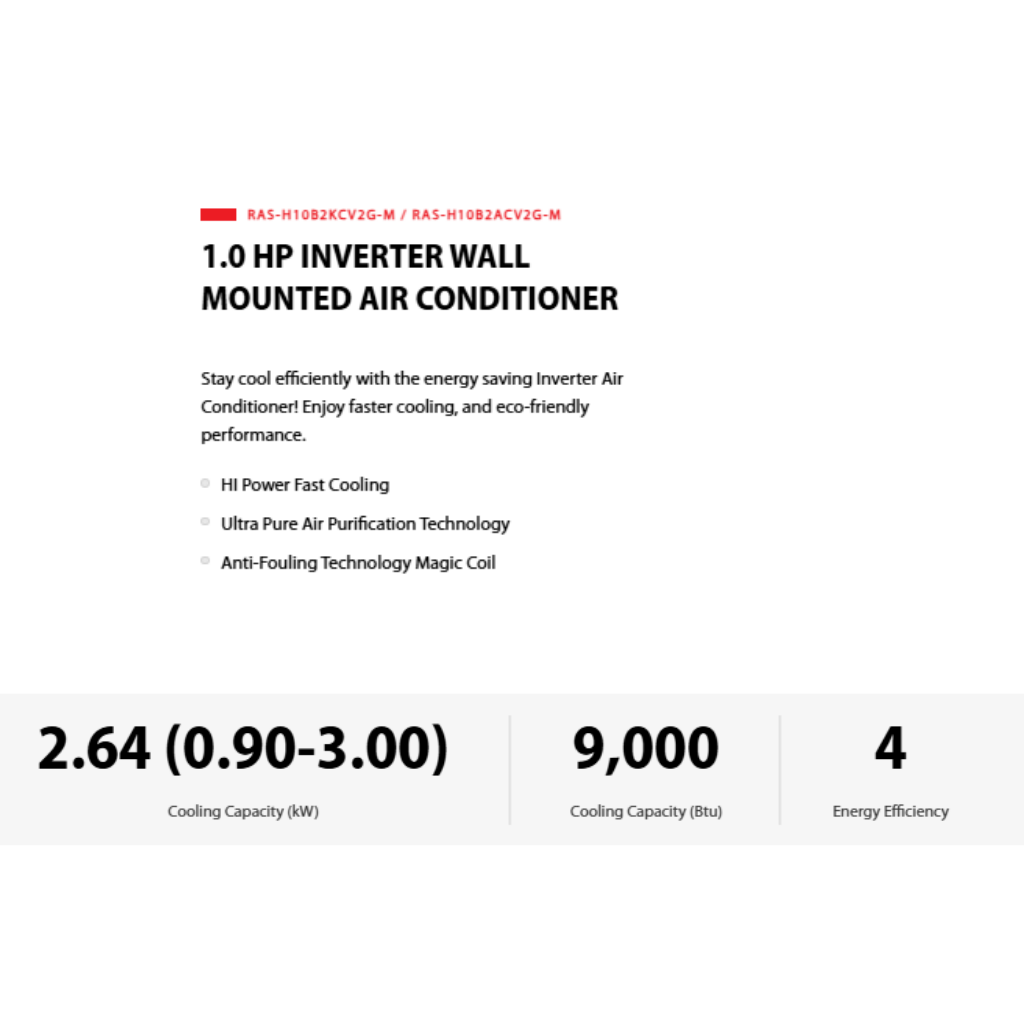 • Capacity: 1.0HP. • Features: Inverter Technology. • Warranty: 5 Years Compressor, 1 Year General Warranty.