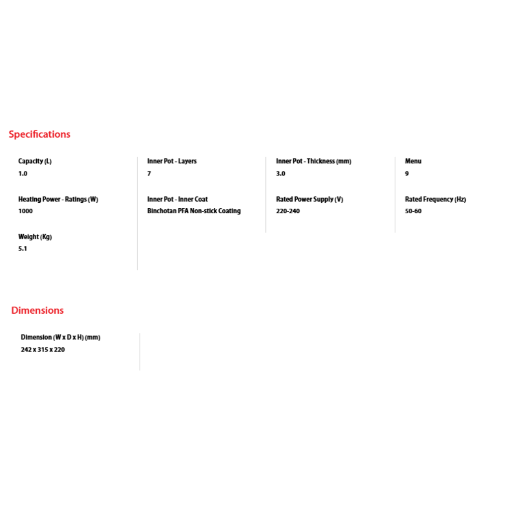• Capacity: 1.0L. • Features: Induction Heating (IH), Low Sugar Cooking. • Warranty: 1 Year General Warranty.
