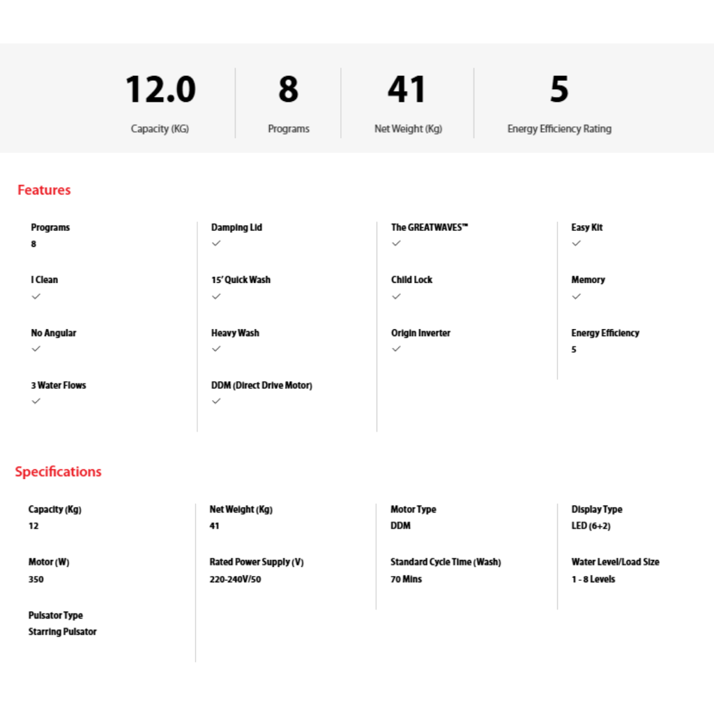 • Capacity: 12.0kg. • Features: Direct Drive Inverter, GreatWaves™. • Color: Dark Grey. • Warranty: 12 Years Motor, 2 Years General Warranty.