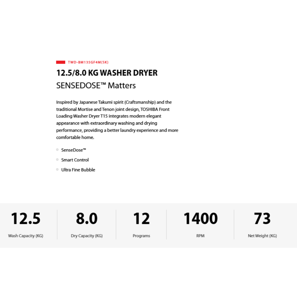 Toshiba 12.5/8.0 Kg Washer Dryer Sensedose™ Matters TWD-BM135GF4M(SK)