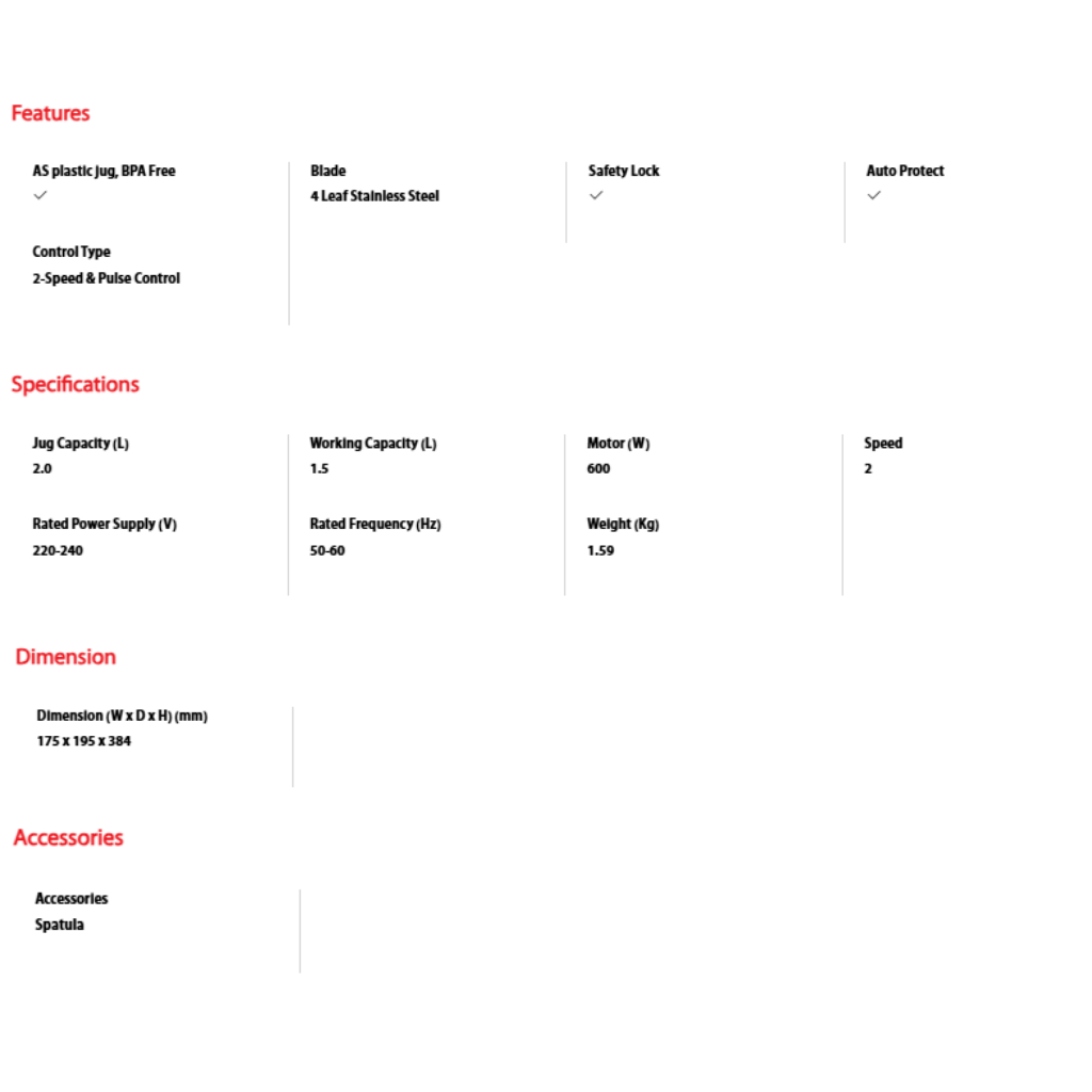 • 2.0L Jug Capacity • 2-Speed & Pulse Control • Removable Blade • REAL SMOOTH POWER • ENJOY SIMPLE HOMEMADE SAUCES • ONE DIAL OPERATION FOR UNLIMITED VERSATILITY • FINE CUTTING • POWERFUL MOTOR • ANTIFLOW LID