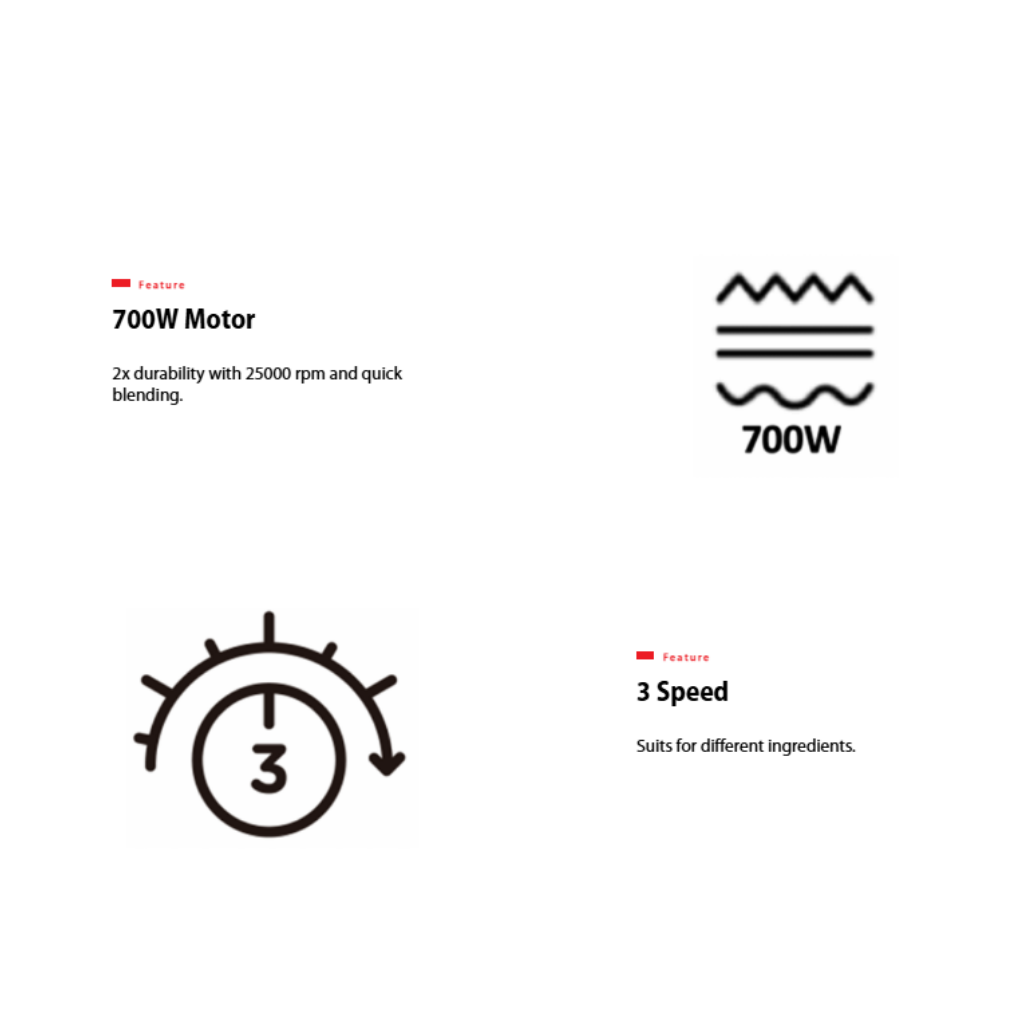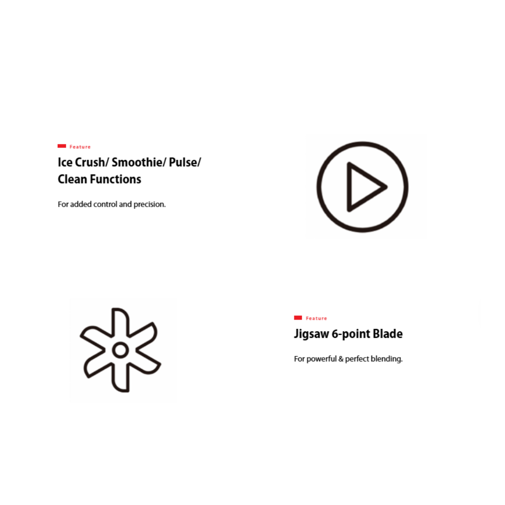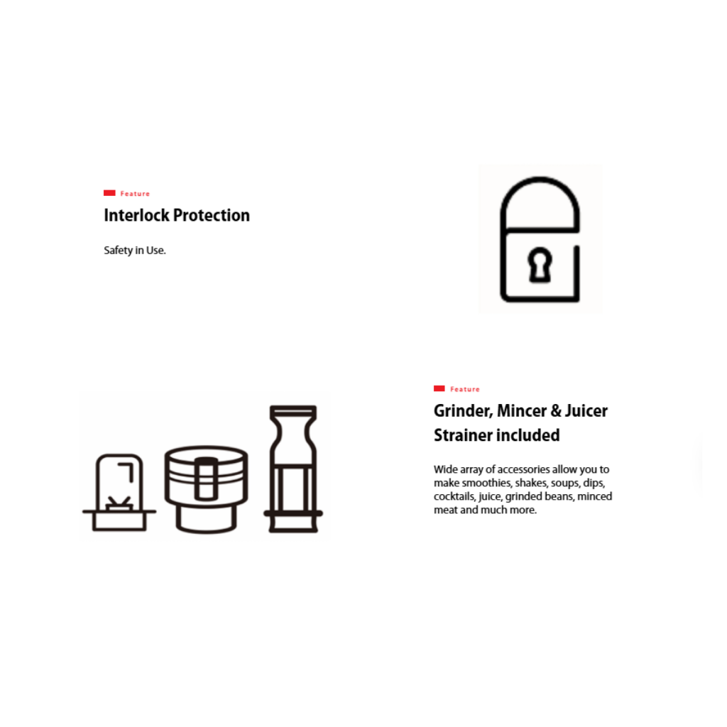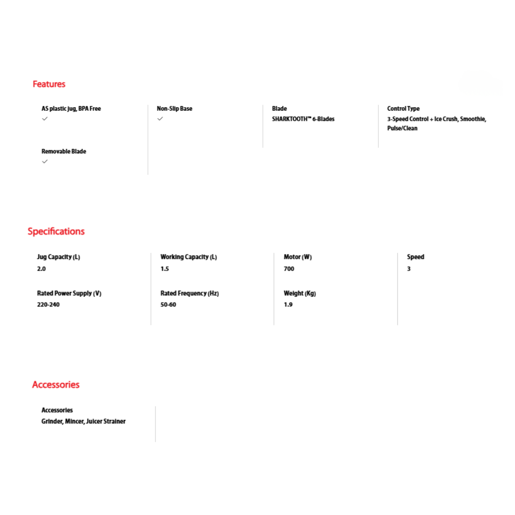 • 3-Speed Control • Smoothie and Ice Crush Function • 2.0L Jug Capacity • 700W Motor • Jigsaw 6-point Blade • Anti-slip Feet • Interlock Protection • Grinder, Mincer & Juicer Strainer included • Removable Blade