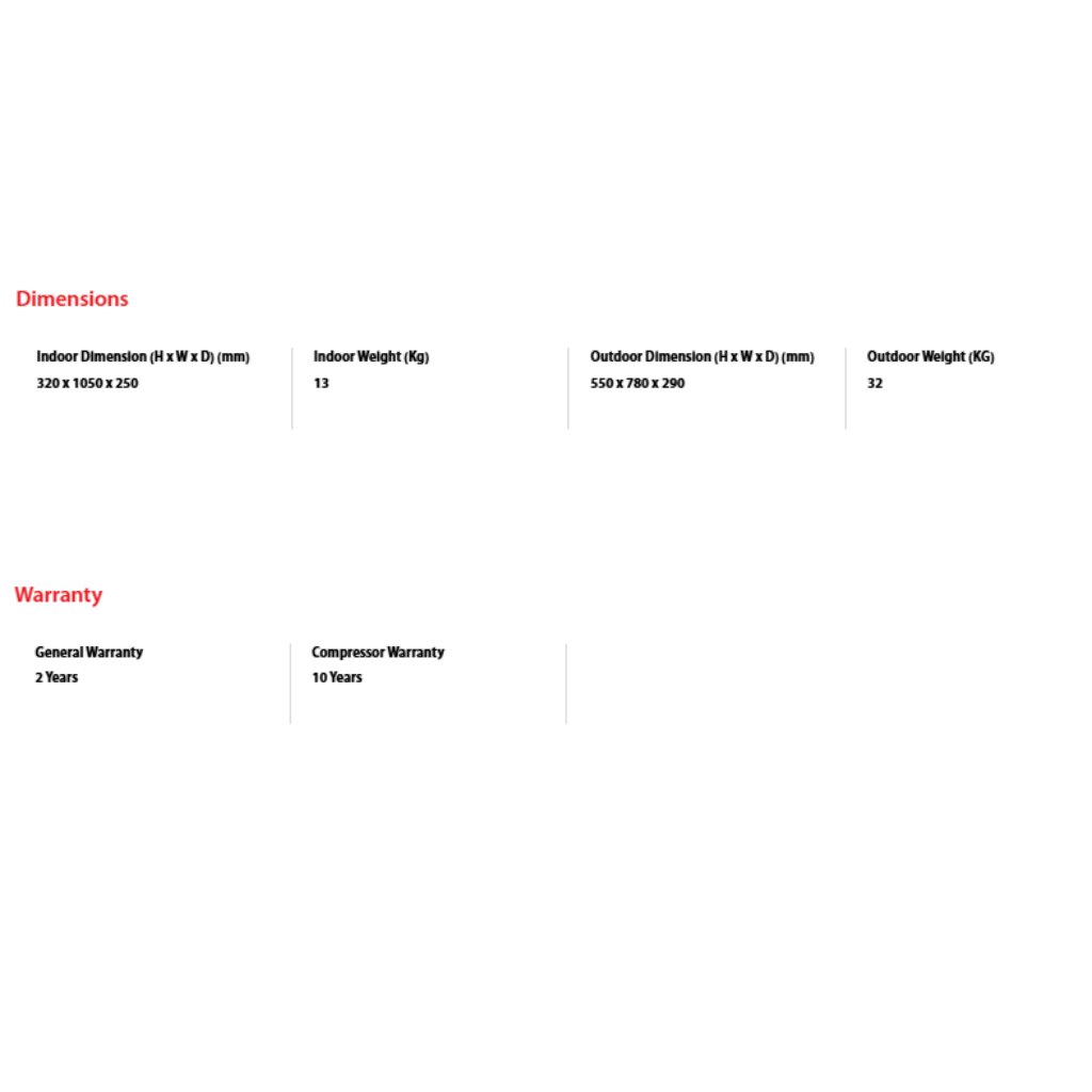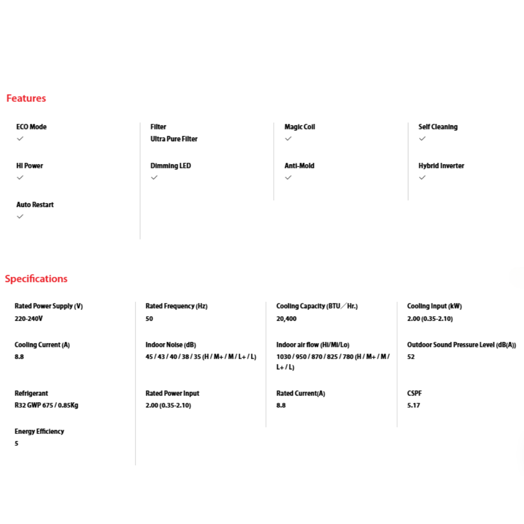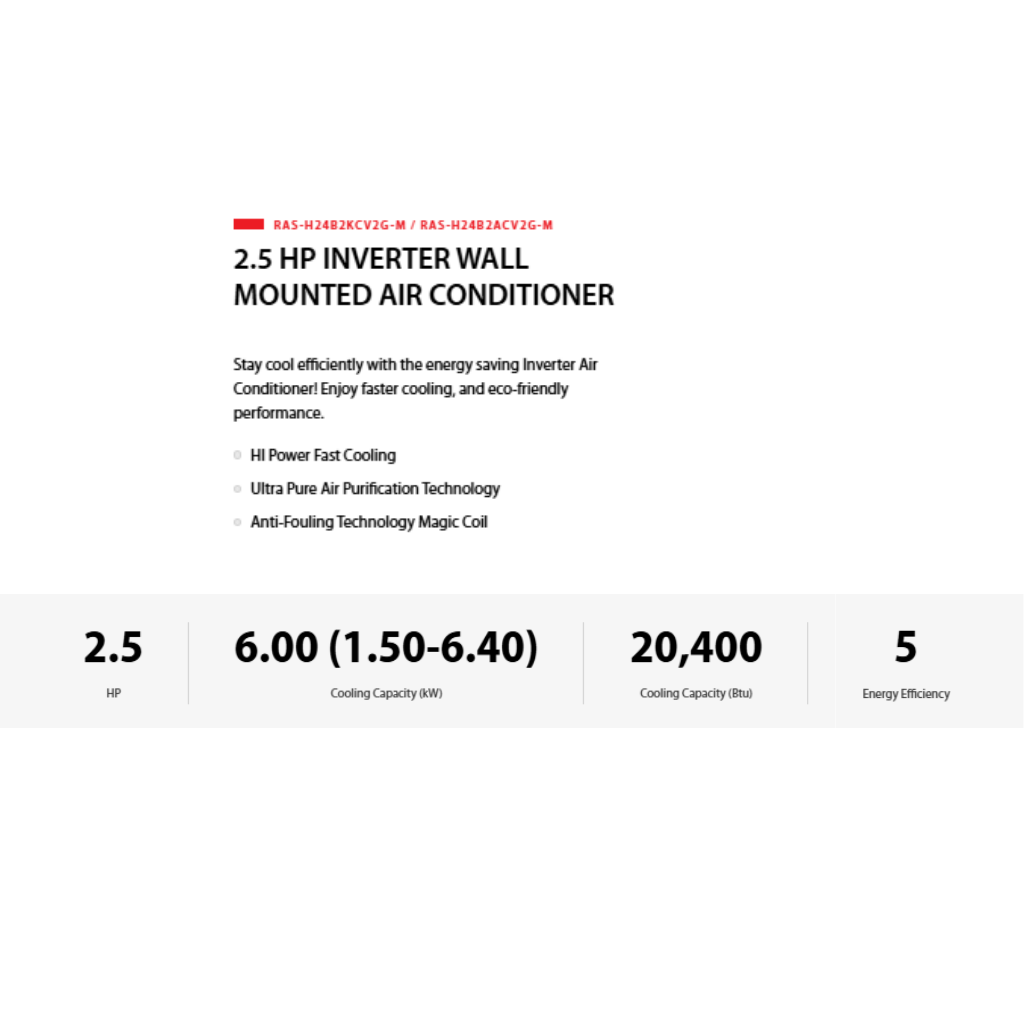 • Capacity: 2.5HP. • Features: Inverter Technology, Magic Coil. • Warranty: 5 Years Compressor, 1 Year General Warranty.