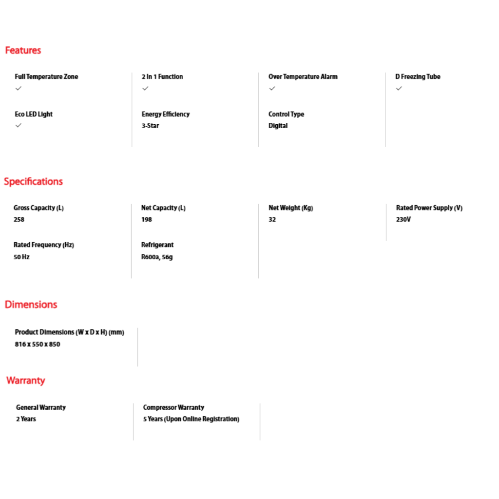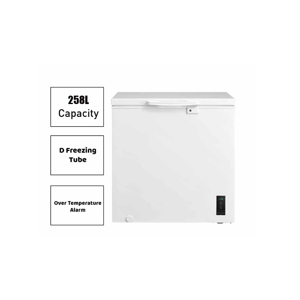 • Full Temperature Zone • Over Temperature Alarm • D Freezing Tube • 2 in 1 CHEST FREEZER • Counter-Balanced Hinge • Single-piece Door Cover Without Edge • Quiet & Slim Hinge • White Inner • LED Light