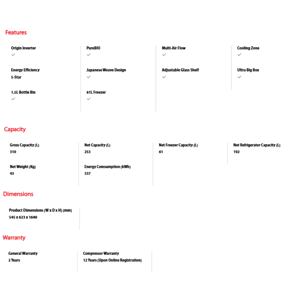 • PureBIO • Origin Inverter • Multi-Air Flow • COOLING ZONE • 61L FREEZER • ADJUSTABLE GLASS SHELF • 1.5L BOTTLE BIN • ULTRA BIG BOX • LED LIGHT • KATANA SHAPED HANDLE