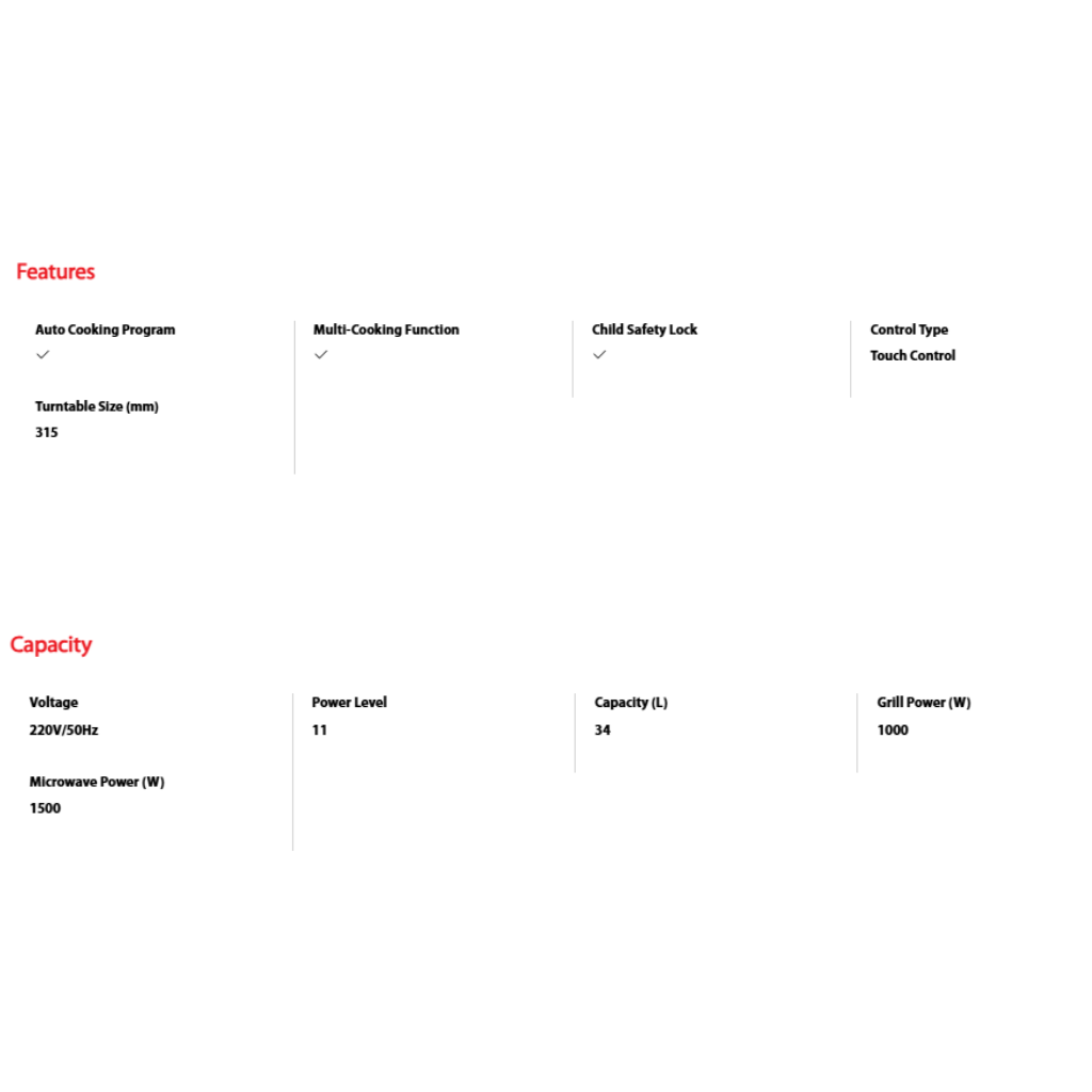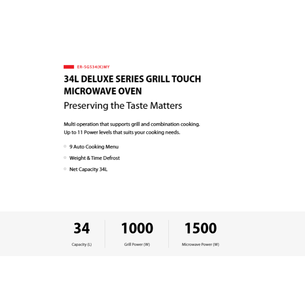 • 9 Auto Cooking Menu • Weight & Time Defrost • Net Capacity 34L • Microwave & Grill Cooking • Auto Cooking Program • Multi-Cooking Function • Child Safety Lock • Control Type : Touch Control