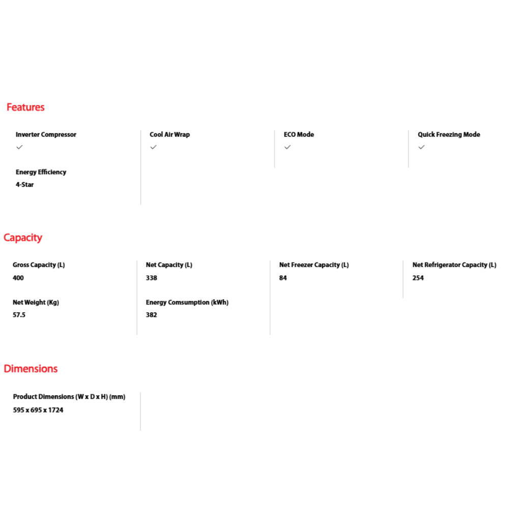 • AirFALL Cooling • Origin Inverter • Cooling Zone • Pure Bio • Humidity Control • Electric Control • Cool Air Wrap • ECO Mode • Quick Freezing Mode