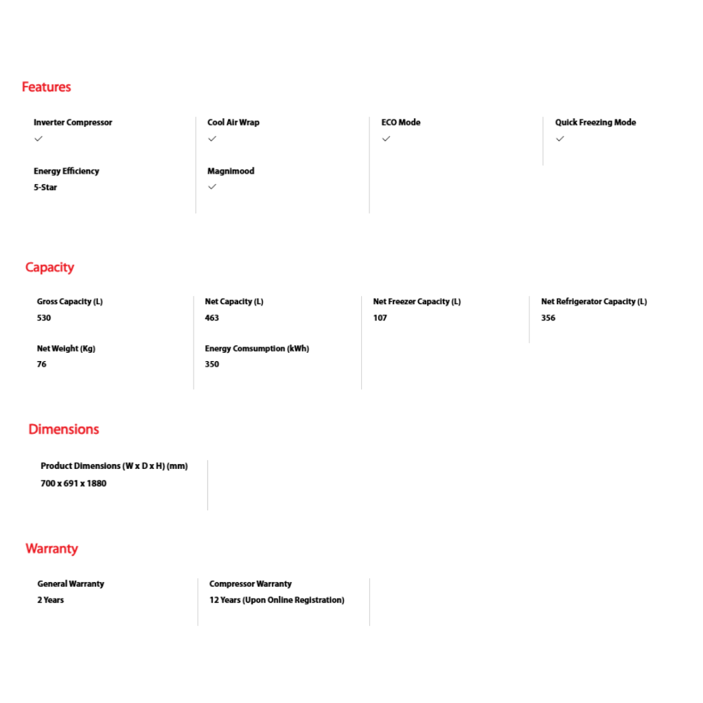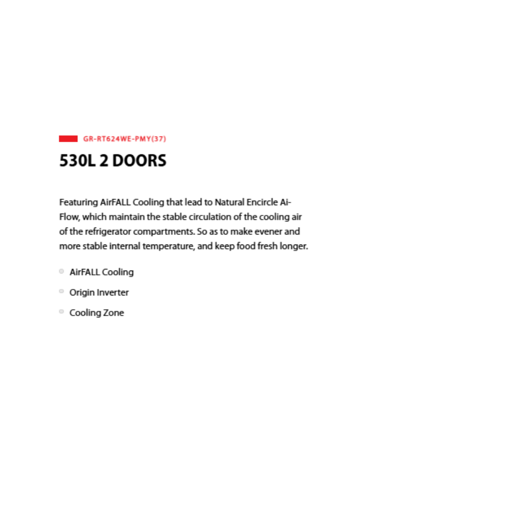 • AirFALL Cooling • Origin Inverter • Cooling Zone • Pure Bio • Humidity Control • Electric Control • Cool Air Wrap • ECO Mode • Quick Freezing Mode • Magnimood