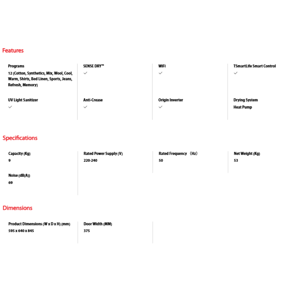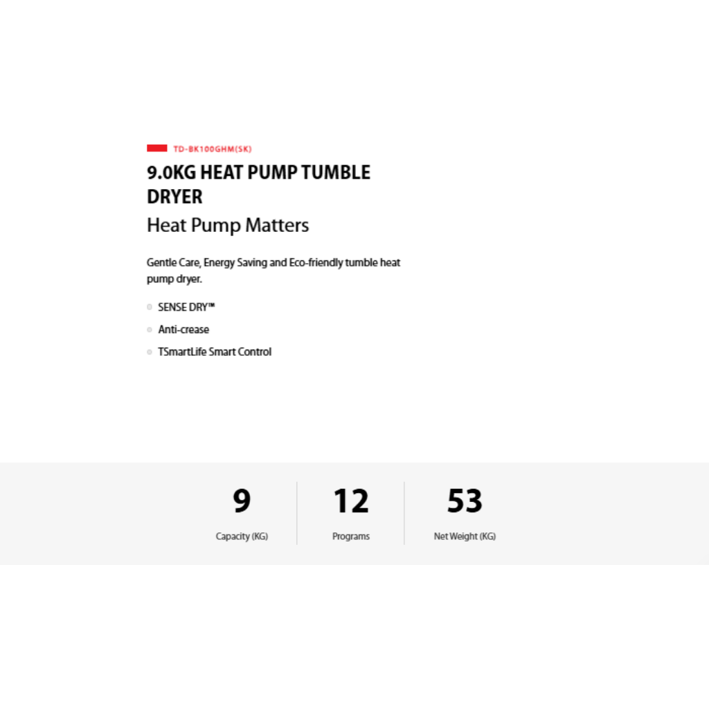 • SENSE DRY™ • Anti-crease • TSmartLife Smart Control • 12 Programs Selection • ORIGIN INVERTER • HEAT PUMP • SMART CONTROL • DRYING CYCLE AUTO SET • HYGIENE • UV SANITIZE • WOOL • STACK • WIFI