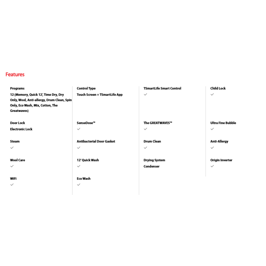 • SENSEDOSE™ • SMART CONTROL • ULTRA FINE BUBBLE • THE GREATWAVES™ • TSmartLife Smart Control • STEAM • DRUM CLEAN • ORIGIN INVERTER • DETAILS MATTER • WiFi